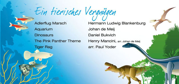 Kaum gelandet aus Adlers Lüften, hieß es: abtauchen! Hinein ins „Aquarium“, zu Neonfischen, Zitteraal und Seepferdchen, denen Johan de Meij ein quicklebendiges musikalisches Denkmal gesetzt hat. Und bevor diese ganze mitreißende Viecherei mit Henry Mancinis „Pink Panther“ und dem unverwüstlichen „Tiger Rag“ wieder in gewöhnlichere Bahnen gelenkt wurde, gab es einen spannenden Ausflug in die Urzeit zu den Dinosauriern. Oder englisch „Dinosaurs“, wie das Werk des amerikanischen Komponisten Daniel Bukvich heißt. Eine intensive Rhythmik zeichnet dieses Stück ebenso aus wie ungewöhnliche Instrumente. Die Musiker ließen Gläser sirren und sangen zur Geburt eines Dino-Babys.